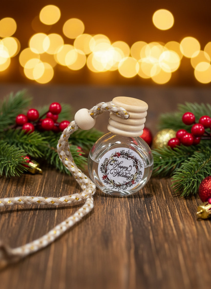 Small glass diffuser bottle filled with your favorite essential oil or fragrance oil. Remove stopper hang in your car or place anyywhere in your home you need a little extra holiday spirit.